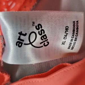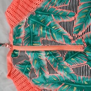 Coral with intricate palm design amd see through style latice around shoulders and small band around waist. Zipper up back. Girls XL 14/16