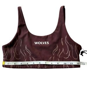Darc Sport Sports Bra Heaven Has To Wait Wolves Ignite Soto Energy Bra in Darc Purple. This sports bra features a repeating flame pattern and 'WOLVES' text across the front. A wolf head graphic is also present on the chest. The tag indicates this is item number 344 of 500.