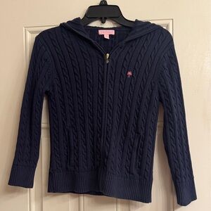 Elegant cable knit design. V-neck style. Pink logo detail adds charm.