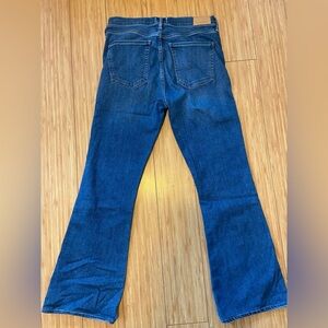 These blue jeans from Citizens Of Humanity feature a stylish flare and wide leg design, offering a modern twist on a classic look. The medium blue denim with subtle fading provides a versatile and timeless appeal. Perfect for any occasion, these jeans combine comfort with a flattering fit.