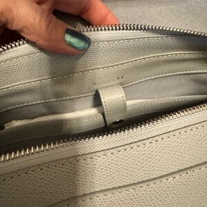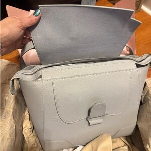 Elegant Senreve satchel in Ice. Versatile and sleek. Ideal for everyday wear. Size is perfect for a large IPad or small laptop. Just purchased but wanted the smaller size and it was Final Sale since it is now discontinued. This includes the gray accessory strap that costs approximately $35.