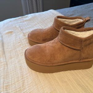 Stylish tan suede slip-on shoes with a platform sole. Comfortable and versatile for any occasion. Never worn. Size 8 runs a little narrow for me