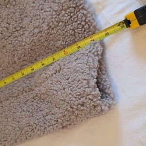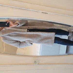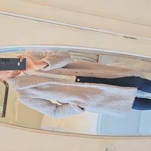 Stay warm and stylish with this cozy sherpa coat. Perfect for chilly days, this coat offers both comfort and elegance. like new, I am five a and I weigh a hundred and twenty three pounds.And I normally wear a size, extra small or small, and this fits me perfect. The color is a beige gray very sophisticated a very warm and stylish
