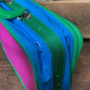 Colorful bag featuring Barney & Baby Bop. Bright pink with green accents. The vintage 1993 Lyons Group BARNEY & BABY BOP Graphic Suitcase is a plush toy featuring the characters Barney and Baby Bop from the popular TV show "Barney and Friends." The suitcase is designed in pink, green, and purple colors, staying true to the characters' appearances on the show. Manufactured by Dakin in 1993, this action figure captures the essence of the beloved cartoon & TV characters from the 1990s. A must-have for fans of Barney and Baby Bop, this collectible item is a nostalgic piece that brings back memories of the classic children's program.