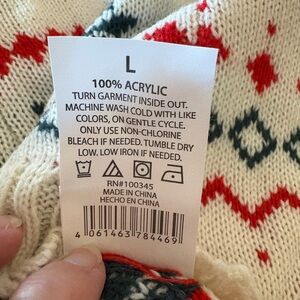 Charming knit dog sweater with a snowflake design. Features red, green, and cream colors for a festive look.
