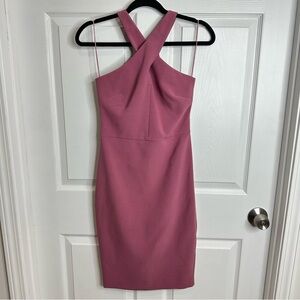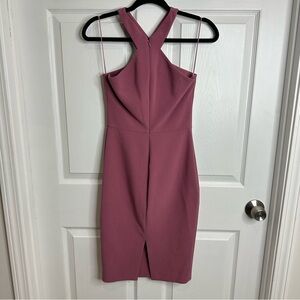 Carolyn dress from LIKELY featuring a sleeveless design, a halter neck, a fitted silhouette, a stretch fit, a knee length, a back zip fastening and a back slit at hem. Perfect for a night out or wedding.