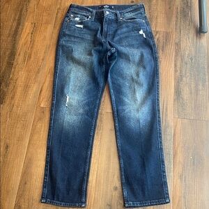 Stylish boot cut jeans. Features intricate gold embroidery on back pocket. Classic blue denim.