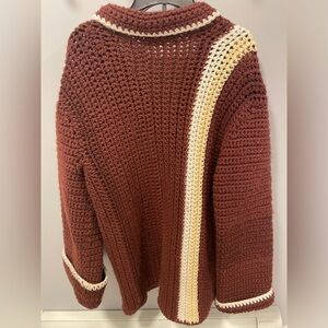 Beautiful chocolate brown 1970s vibe button up cardigan. Heavy wool, wears like a blanket! Super cozy. Cream and white stripe down one side, white knit trim. 22” Ptp and 32” shoulder to hem. Fits oversized.