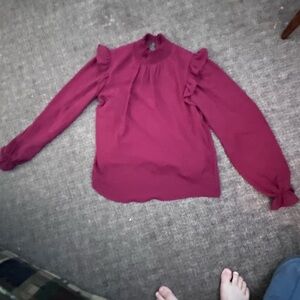 Vibrant red blouse featuring intricate patterns. Accentuated with a delicate lace hem. Perfect for casual outings.