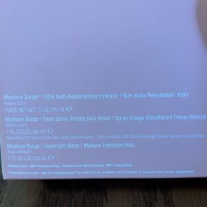 Clinique skincare set featuring Moisture Surge products. Includes a cream, spray, and mask. Perfect for hydration. Brand new- never opened!