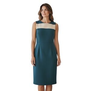 Keywords: Anne Klein, sheath dress, colorblock, business casual, workwear, professional, sleeveless, teal dress, ivory dress, classic, tailored, elegant, office attire