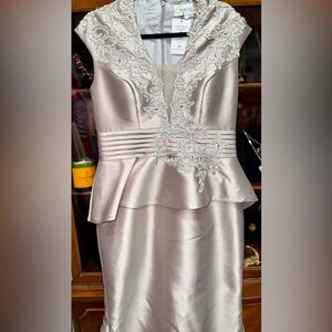 Sophistication meets structure in this champagne satin gown by Feriani Couture. The plunging neckline is trimmed with silver embroidered appliqué, while a ruched waist and peplum overlay offer a flattering fit. The fit-and-flare silhouette adds grace and confidence to any formal event—perfect for the mother of the bride, gala night, or red carpet affair.