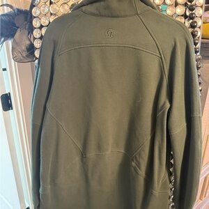 Cozy half-zip sweatshirt. Features a front pocket and stylish gold zipper. Perfect for casual wear. Couple small spots I haven’t tried getting out. Lost weight. Coaching out the closet. M/L.