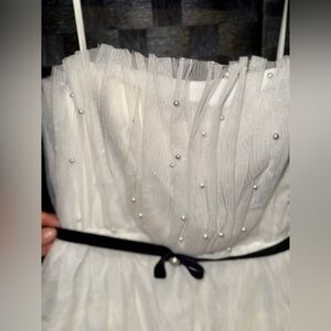 Floor-sweeping tulle, faux pearls, & a velvet belt pull this gorgeous look