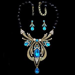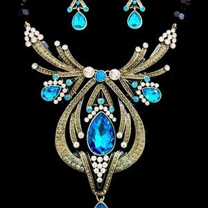 Elegant necklace with vibrant blue stones. Intricate gold detailing. Includes matching earrings.
