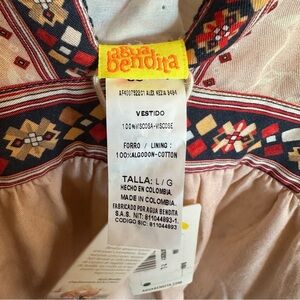 New with tags Agua Bendita Alex Kezia mini dress. Women’s size large. Flowy bohemian style with 3/4 length balloon sleeves that end in a tie cuff. Lightweight viscose that is lined. Gorgeous gathered waist with a plunging neckline and a tie in the back. Geometric floral print in a light pink with darker shades of pink, red, navy and a tan colour. The dress is brand new, with the tags attached, but in the back there is a small section where the stitching has come undone. Can be mended. This can be seen in the attached listing photos.
