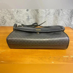 Black Liz Claiborne purse, 1984, genuine leather. Has outer back open pocket, 3 inner pockets with a zip small pocket, snap closure. Vintage, Preowned, has marks on inside as seen in photo and one side has marks by the bottom of the purse, see photos. Strap is adjustable but the belt slide is missing.
