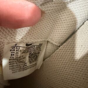 Nike shoes with a cream upper and black swoosh. Sleek and sporty look.