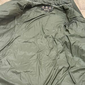 Chic olive puffer jacket by Barbour. Features a stylish faux fur trim which is removable. Ideal for cold weather, goes to about mid thigh. Please note all photos, there are a few noted stains that just need a wash, and there is a pull in the left sleeve, and a rip on the back upper right. Just needs patching but in amazing condition otherwise