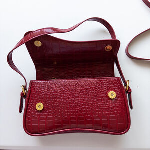 Elevate your accessories game with this luxe red faux-croc crossbody bag. Features a unique asymmetrical flap, structured silhouette, and gold-tone hardware. The interior has multiple compartments including a zippered pocket for secure storage. ❤️ Brand new ❤️ Purse is 10 inches wide and 6 inches tall ❤️ High-gloss crocodile-embossed texture ❤️ Adjustable shoulder/crossbody strap ❤️ Comes with two different length straps for versatility ❤️ Magnetic snap closure ❤️ Interior zipper divider and fabric lining Perfect for brunch, dinner dates, or adding a pop of color to your everyday look. New and unused. Ships fast from a smoke-free, pet-friendly home.