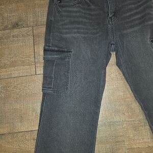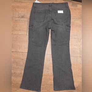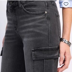 These are the KanCan Nyla mid-rise baby boot cargo jeans, which feature a black or washed black denim color, cargo pockets on the thighs, and a slit hem at the ankle. They offer a comfort stretch fit and have a slight flare or bootcut leg.