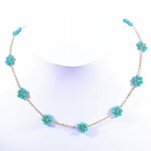 Elegant floral necklace featuring blue flowers on a gold chain. Perfect for adding a touch of color to any outfit.