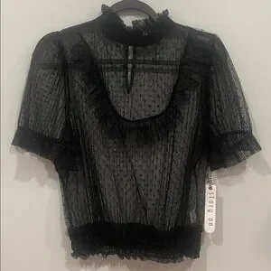 Sophisticated black sheer top with ruffle details, perfect for any occasion.