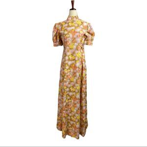 Vintage 60s Daisy Floral Puff Sleeve Mock Neck Bow Waist Belt Maxi Dress