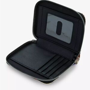 Sistahhhs! Fly through Salem with your witchy essentials in this Hocus Pocus mini zipper wallet! Featuring an allover print of tattoo-inspired designs of Binx's tombstone, brooms, the Sanderson Sisters and other icons from the film. Comes with 5 card slots and a clear ID display.