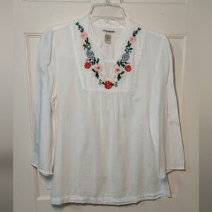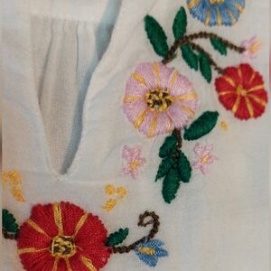 Cute white cotton top with colorful floral embroidery on yoke, size S.