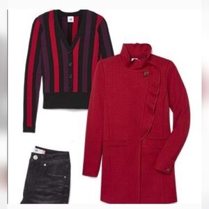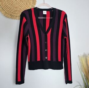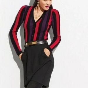 CAbi, Royal Colorblock Style #3538 Striped Ribbed Stretch Knit Button Front Pullover Cardi Sweater, Size Medium