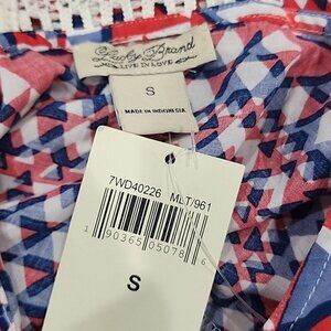 Add a touch of bohemian style to your wardrobe with this beautiful Lucky Brand halter top. The red color and geometric pattern make it perfect for summer and spring occasions, whether you're traveling or going out casually. The sleeveless design and adjustable straps relaxed fit make it comfortable to wear, while the V-neckline and lace straps add a touch of elegance.