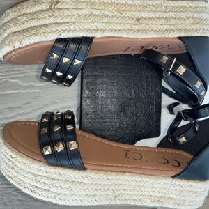 These Coccoli sandals feature a sleek black design with multiple thin straps creating a geometric pattern across the foot. The ankle strap with a buckle ensures a secure fit, while the flat sole offers comfort for casual outings.
