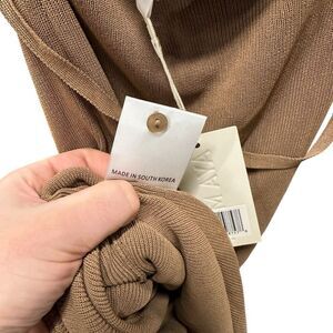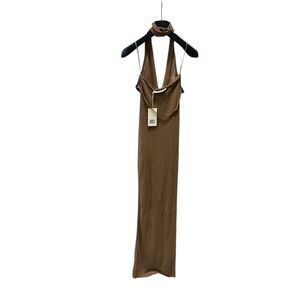Smoke free, pet free warehouse. New with tags, retail $750. Stretchy knit jersey fabric. Maxi length. Slit down one side. Draped cowl halter neck with a button close high neck collar. Open strappy back. Medium warm brown color
