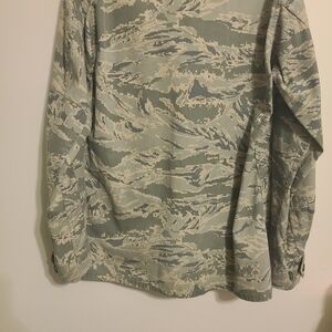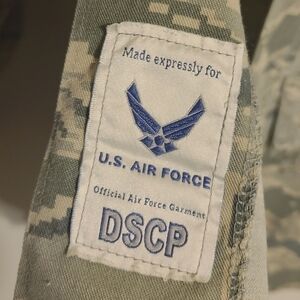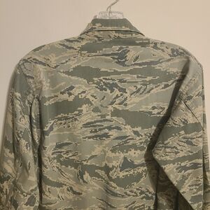 Made expressly for the United States Air Force, this camo shirt jacket is authentic as they come. Size 36 regular vintage camo shirt jacket. Button down shirt jacket has a US Air Force patch on the sleeve and four button pockets in the front. Buttons on wrists. Excellent pre-owned condition; no flaws.