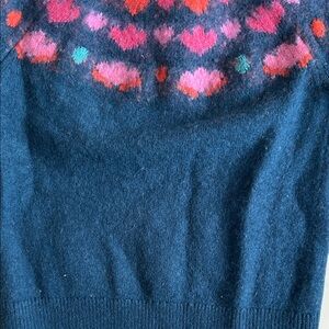 Charming dark blue sweater with colorful heart pattern. Second sweater is grey with some color. Perfect for a cozy, cheerful style. Both sweaters are pilling heavily which is why I am selling them at a heavily discounted price, the grey sweater has some small stains (see photos). Both sweaters are still wearable and very warm. The composition is 54 percent wool, 40 percent polyamide, 5 percent cashmere and 1 percent cotton (green sweater) and 55 percent wool, 40 percent polyamide and 5 percent cashmere (grey sweater).