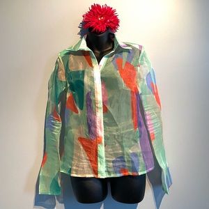 Featuring an orange hue organza material with a contrasting print. Beautiful red buttons on the sleeves