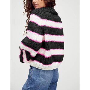 Women's Stripe Pullover Sweater Turtleneck Ribbed Knit Top Chunky Knitwear Black