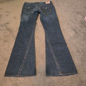EUC Dark blue True Religion jeans with floral and butterfly embroidery. Relaxed fit with flare leg.