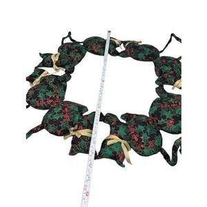 Keywords: Christmas decor, holiday garland, fabric ornaments, holly print, stuffed animals, winter decor, seasonal decoration, festive, whimsical, craft, handmade, tier tray decor, shelf sitter, wall hanging