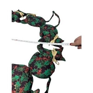 A festive Christmas garland featuring stuffed fabric critters adorned with a classic holly berry print.