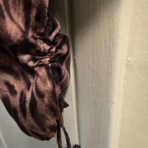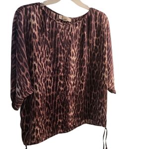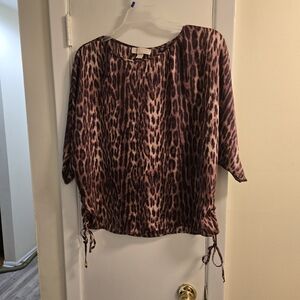 Chic animal print blouse with a relaxed fit. Features a stylish drawstring detail. Ideal for versatile wear. missing gold MK beads on lt side of drawstring ties.