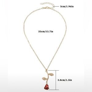 Elegant gold necklace featuring a stunning red rose pendant. Perfect for adding a touch of romance to any outfit.