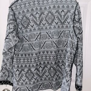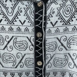 Stylish jacket with intricate geometric patterns. Features a button-up front and two pockets. Handmade, no labels. Great condition. Super soft and comfy to wear. It fits a size large respectively.
