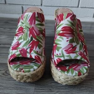 Pink and green tropical print fabric shapes a peep-toe upper and a wide toe strap (with a stretchy elastic gusset at the instep) that sits atop a contrasting 1.5" raffia-wrapped toe platform and a matching block heel. An easy slip-on design makes these chic heels a must-have for any sunny weather occasion!