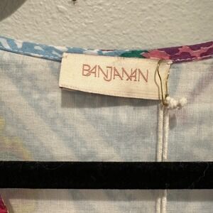 A vibrant maxi dress from Banjanan featuring an eye-catching bird and floral print on a white background. This dress showcases a flattering V-neckline, long puff sleeves with buttoned cuffs, and a self-tie waist that cinches for a personalized fit. The tiered skirt adds movement and a feminine silhouette. Perfect for a garden party, a summer vacation, or a casual brunch.