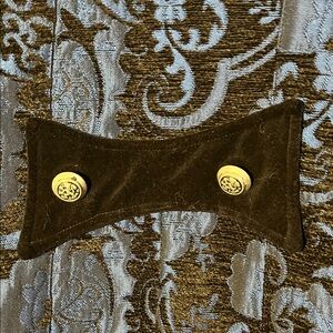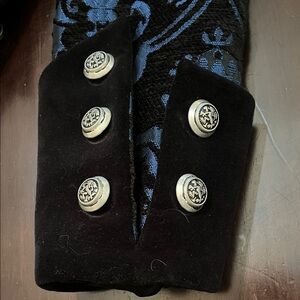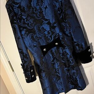 Stunning blue and black brocade coat with silver buttons. Perfect for a bold statement.