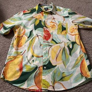 Bright and bold fruit design. Ideal for casual outings. Short sleeves and button-down style.
