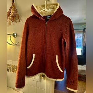 Navy zip-up featuring vivid stripes in red, yellow, and blue. Includes hood and front pockets.