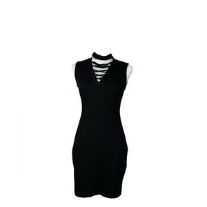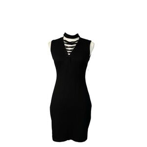 Dress like you've got plans you can't cancel in this flirtatious body-con dress that's topped with a cool band collar and plenty of crisscrossing straps. - Mock collar - Sleeveless - Front lace-up detail - Back zip closure - Lined - Approx. 33" length (size S) - Made in the USA